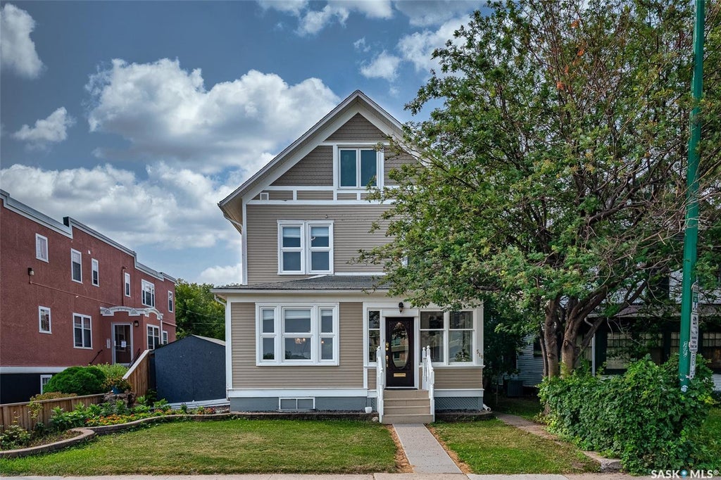 Just steps from the Saskatchewan River, tucked into the historic Nutana Neighbourhood, this Character 1911 home has been lovingly restored for clients who appreciate the history and location of this property. This spacious home has a completely renovated kitchen with quartz countertops, new cupboards and backsplash, under counter lighting, all new appliances, including a newer large wine and beer fridge and a nice open floorplan flowing through to the dining room and living room. An office space and main floor laundry are a great convenience on the main floor. Four- piece bathrooms on each of first two floors and half bath on third floor are convenient. Three large bedrooms on the second floor, one with a very large walk-in closet with window. (Could be used as a nursery.) One of the bedrooms on the second floor can also be used as a Sunroom. A new staircase leads to the third floor where the primary bedroom could be located. This room could also be used as a bonus room or very large office. Owner has replaced much of the crown molding to return this property to its original glory. There are South facing decks off the second and third floor as well as a back deck off the kitchen, also South facing. Most windows are new. Furnace, water heater and reverse osmosis recently changed. New paint everywhere and new engineered hardwood flooring make this is a turnkey property (Vinyl planking on the 3rd floor). Arches, tall baseboards, bay windows and glass doors complete the historic look of this home. This property has a completely fenced in backyard with board sidewalk leading to parking off the back alley. There is room for a garage. The owner has also created a small oasis of gardening boxes tucked around the back yard which is drenched in sunshine most of the day. Come and visit this beautifully renovated historic home, you’ll be glad you did.