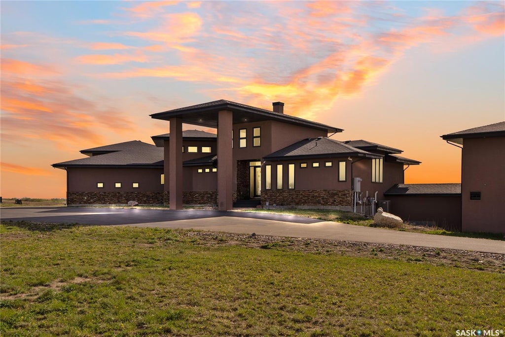 EXTRAORDINARY GATED ESTATE – WALKOUT BUNGALOW WITH ATTACHED INDOOR RESORT-STYLE POOL COMPLEX Prepare to be amazed by this 2,583 sq ft walkout bungalow on 5 GATED acres minutes east on Bergheim Road (Mission Ridge). With pavement to the door, stately iron gates, and an impressive asphalt drive, this property welcomes you with curated luxury. A custom modern interior fountain sets the tone for what’s to come. The main floor boasts a spectacular layout, including a dream kitchen, grand living and dining areas, den, 3 beds, 3 baths, laundry room, and an incredible primary suite. The kitchen features: • Commercial glass-front cooler • Viking and JennAir prof appliances • Gas cooktop, double wall ovens • Tall ceilings w/clerestory windows • Stone backsplash, full-height cabinetry • Large peninsula eating bar The great room stuns with a stone wall and a linear gas fireplace, 2 lounge areas, deck access. The expansive primary suite offers a spa-like experience with an extensively tiled ensuite, inset tub, oversized walk-in shower, dual vanities, and huge walk-in. Downstairs, enjoy 2,500 sq ft of finished space: • 3 more bedrooms, 2 full bathrooms • Family+games room • Professional ultimate theatre and gym AND THEN THERE’S THE RESORT… An attached 2,000 sq ft indoor pool complex with soaring ceilings, a saltwater pool w/ lights and waterslide, massive hot tub, full bar with 4 TVs, yoga loft, bathroom, hi tech specialized mechanical, glass overhead door to a deck, stamped concrete throughout. Simply paradise – no vacation needed! Outside: 5 scenic acres landscaped/rockscaping, decks and patios with panoramic prairie vistas Additional features:Triple attached garage, Smart home system w/speakers, 12-camera security, 400 amp service, interior by Atmosphere Design, auto blinds, tall ceilings w/clerestory windows, Forced air + boiler, in-floor heat garage and lower level. This home is unmatched in design and lifestyle. Floor plans in supplements.