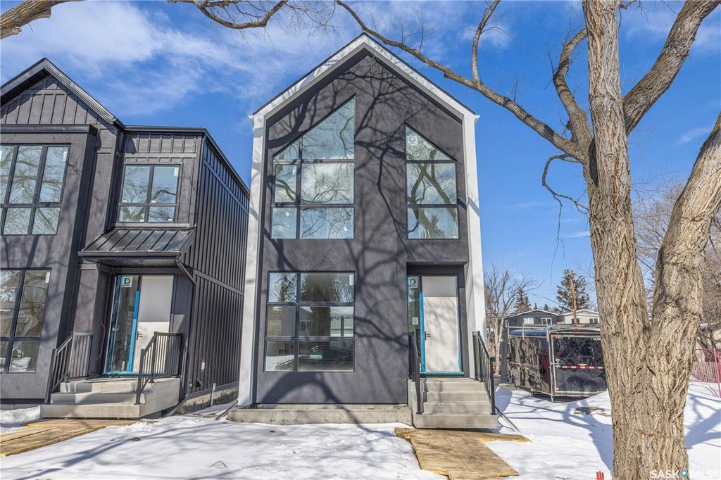 Welcome to 1139 13th Street East, a stunning, newly built home in the heart of Varsity View. This corner lot build offers 1,732 sq. ft. of refined two storey living space, plus an 839 sq. ft. basement with a separate side entrance for a future secondary suite. This 3-bedroom, 2.5-bath home showcases high-end finishes throughout, including an amazing full second floor vaulted ceiling, quartz countertops, Frigidaire Professional appliances with built-in wall ovens and a 36" induction cooktop, and premium fixtures. The spacious primary suite features a luxurious ensuite with a soaker tub, custom tile shower, and electric in-floor heating. Designed for both comfort and performance, the home features 9’ ceilings on both the main and basement levels, thickened exterior walls with R28 insulation, and insulated interior walls to enhance privacy and reduce sound transfer. The basement includes in-floor hydronic heating for maximum winter comfort, and the main living area is bright and airy thanks to extra-large triple-pane windows. Outside, enjoy a rear 10' x 10' deck with black aluminum railings, James Hardie fiber cement siding and stucco exterior, and a detached 22x24 double car garage. This home combines elegance, energy efficiency, and flexibility—perfect for modern living. Don’t miss your chance to make it yours—contact your REALTOR® today and ask about the secondary suite incentive program.please note;interior photos are renderings and may not be built exactly as shown.