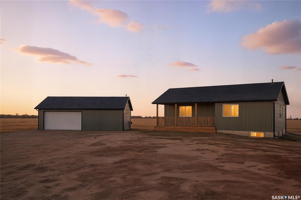 What an Opportunity! Just minutes west of Saskatoon-enjoy peaceful acreage living with city convenience! This newly constructed property sits on 7 acres and offers just over 1,700 sq. ft. of developed space (856 sq. ft. on the main level), featuring 4 beds, two baths, a fully developed basement, and an impressive heated triple detached garage (36' wide with a double overhead door). The home welcomes you home with a charming covered front porch and a functional large foyer complete with a built-in bench and a separate boot room area with floor-to-ceiling wardrobes. The open-concept main floor connects a spacious living room, dining area, and kitchen.